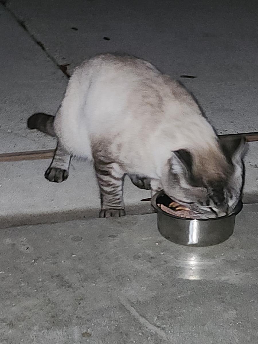 Comes to our house almost every day, starving cat, maybe female. May have kittens, eats lots goes away, comes back to eat more.